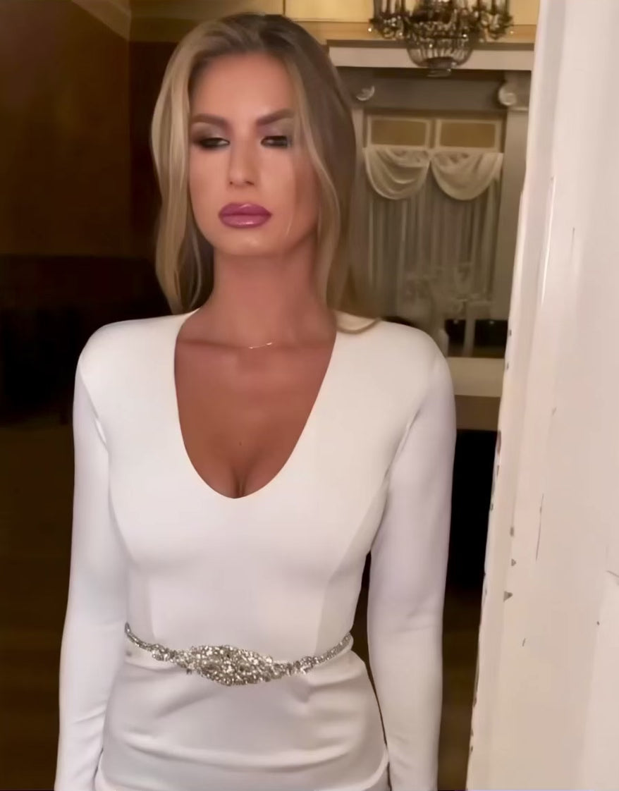 A subtle crystal waist detail introduces contrast and quiet shine.